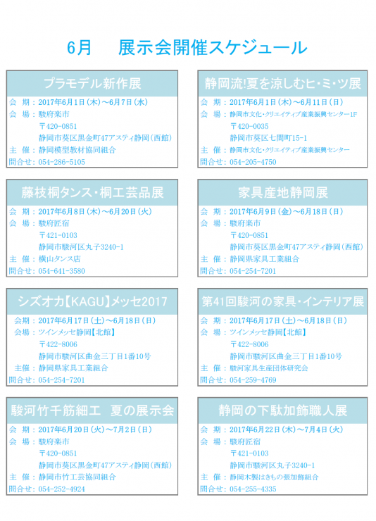 平成29年度 6月展示会開催スケジュール 2017/06/02 天気予報が気になる季節となりました。静岡特産工業協会に加盟している組合・事業者が主催する展示会をお知らせします。ぜひ、お立ち寄りください。
